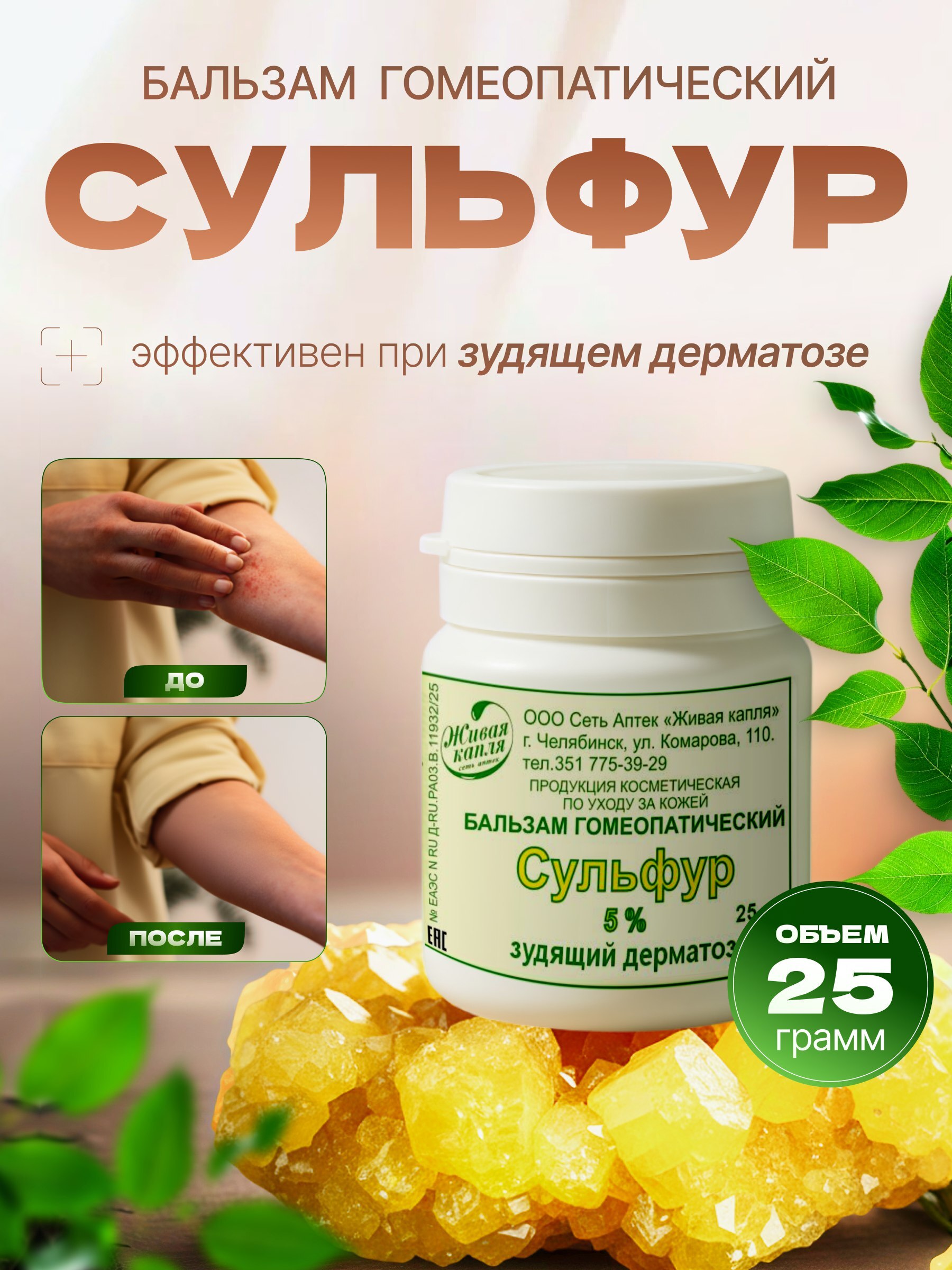 Гомеопатический бальзам «Сульфур» от бренда «Живая капля» создан для мягкого ухода за кожей с зудящим дерматозом. Его формула сочетает вазелин и сульфур — натуральные компоненты, которые питают эпидермис, устраняют сухость и способствуют восстановлению защитного барьера кожи. Продукт подходит для ежедневного применения благодаря нежной консистенции и легкой текстуре. Удобный объем обеспечивает длительное использование, а срок годности гарантирует свежесть средства до момента полного расходования.