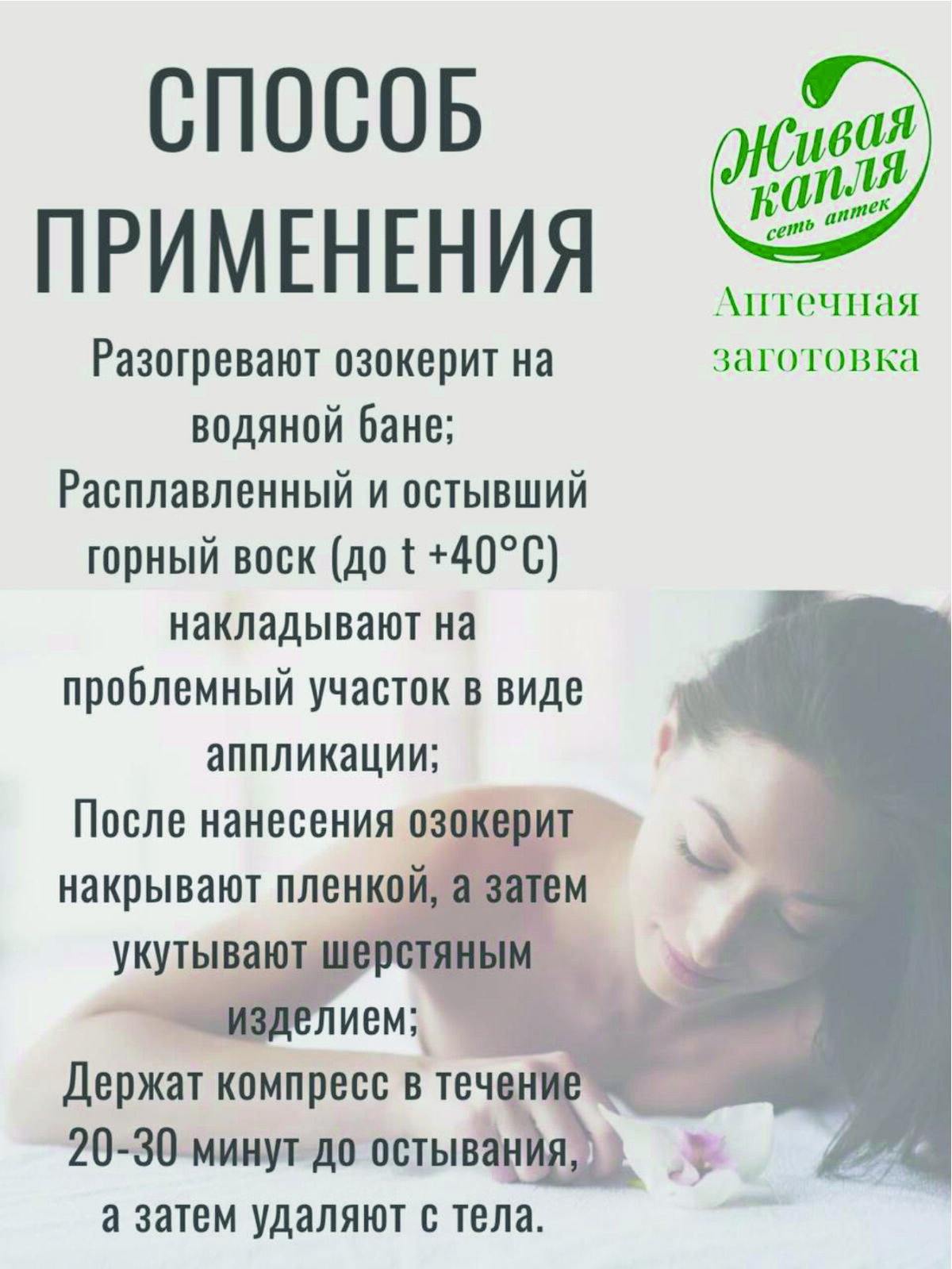 Расплавленный и остывший горный воск (до t +40°C) накладывают на проблемный участок в виде аппликации;