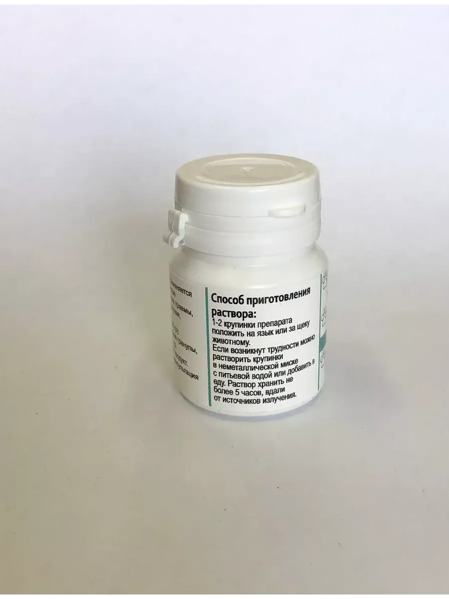 Способ приготовления раствора. За один прием 1-2 крупинки препарата положить на язык или за щеку животному. Если возникнут трудности, то можно растворить крупинки в миске с питьевой водой или добавить в еду. Не использовать металлическую посуду. Раствор хранить не более 5 часов, вдали от источников излучения.