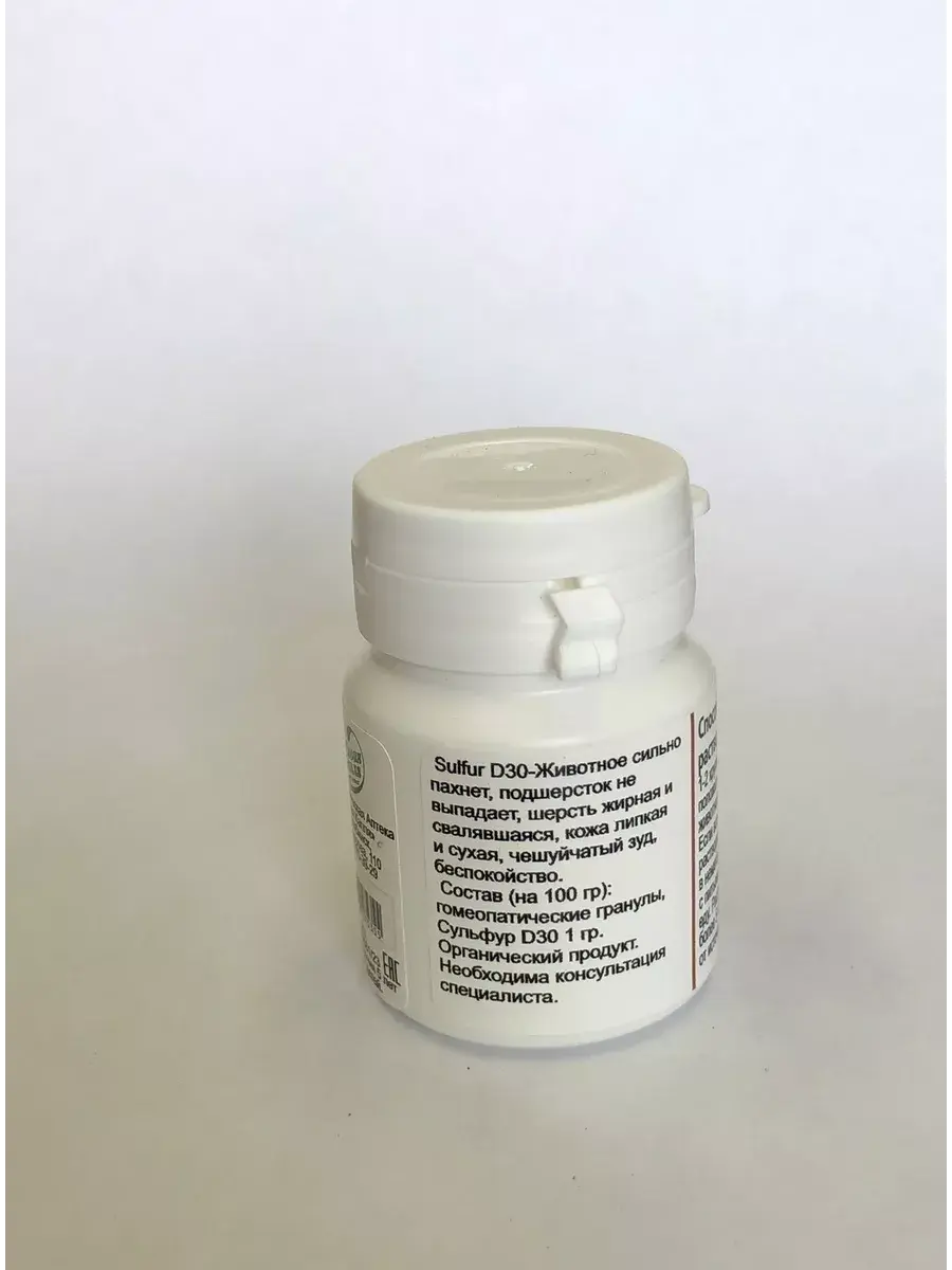 Sulfur D30-Животное сильно пахнет, подшерсток не выпадает, шерсть жирная и свалявшаяся, кожа липкая и сухая, чешуйчатый зуд, беспокойство. Органический продукт.