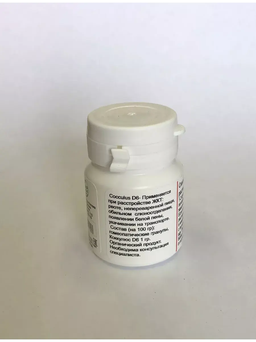 Cocculus D6- Применяется при расстройстве ЖКТ (рвоте) , непереваренной пищи, обильном слюноотделении, появлении белой пены, укачивании на транспорте. Органический продукт.